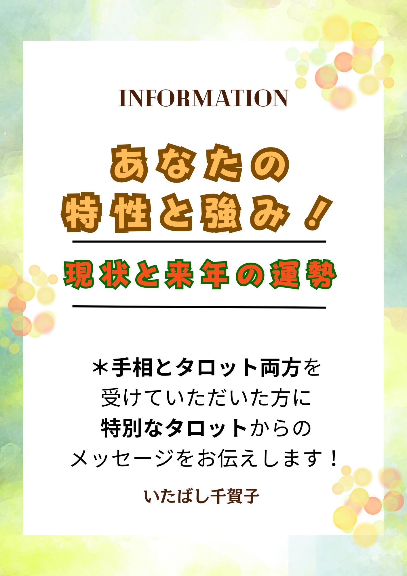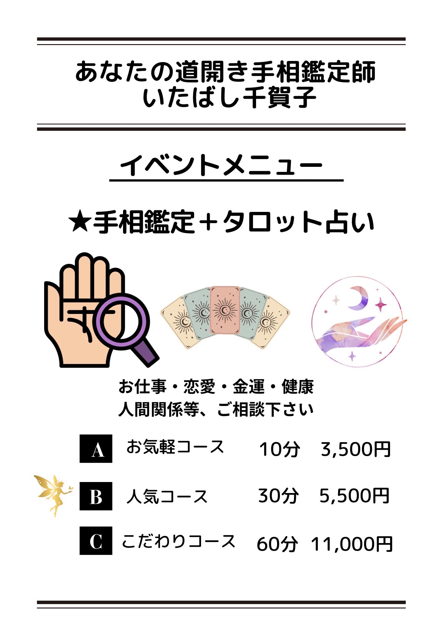 あなたの道ひらき手相鑑定士いたばし千賀子ですhttps://ameblo.jp/itinituiteyo-idonn■イベントメニュー手相鑑定・・・20分2000円タロット占い・・・20分2000円 ★すごくおすすめ!手相鑑定+タロット占いおまかせコース・・・30分3000円*各イベントの開始時間が異なります。予約時間のお間違えのないようにお願いします。■土日祝を除き48時間経っても返信のメールが届かない場合には、アドレス違いやシステムエラーの可能性があります。【迷惑メールフォルダ】もあわせてご確認をお願いいたします。