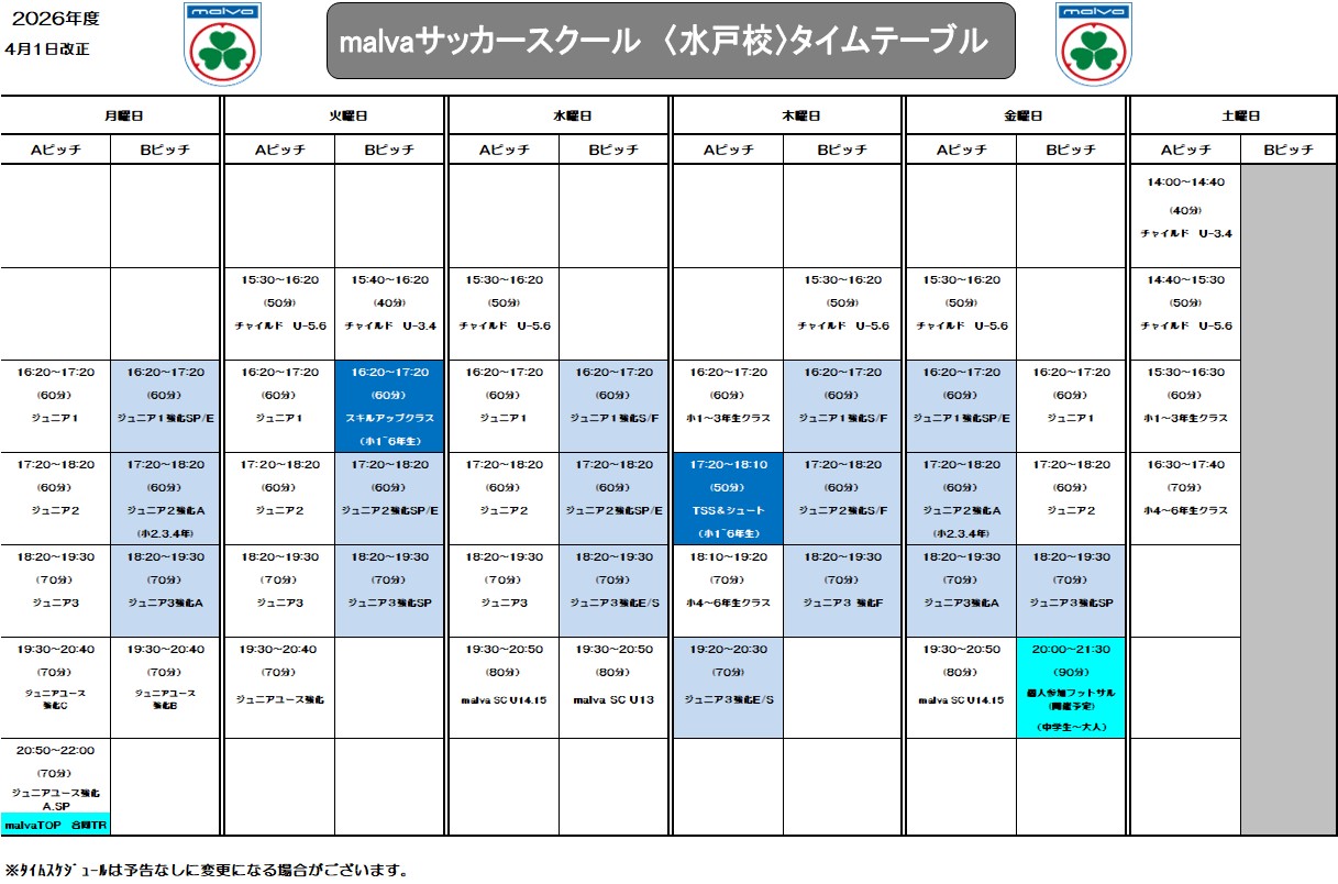 受講クラスの曜日等の変更を希望する場合、malva サッカースクール HP 水戸校ページ