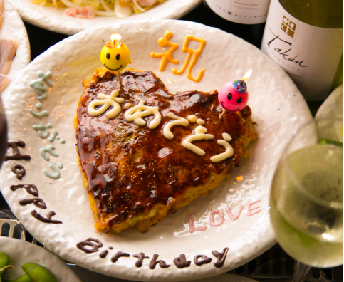 コースをご注文のお客様に『バースデーお好み焼き』を無料でプレゼントいたします。単品注文のお客様にはお好み焼き代が発生します。