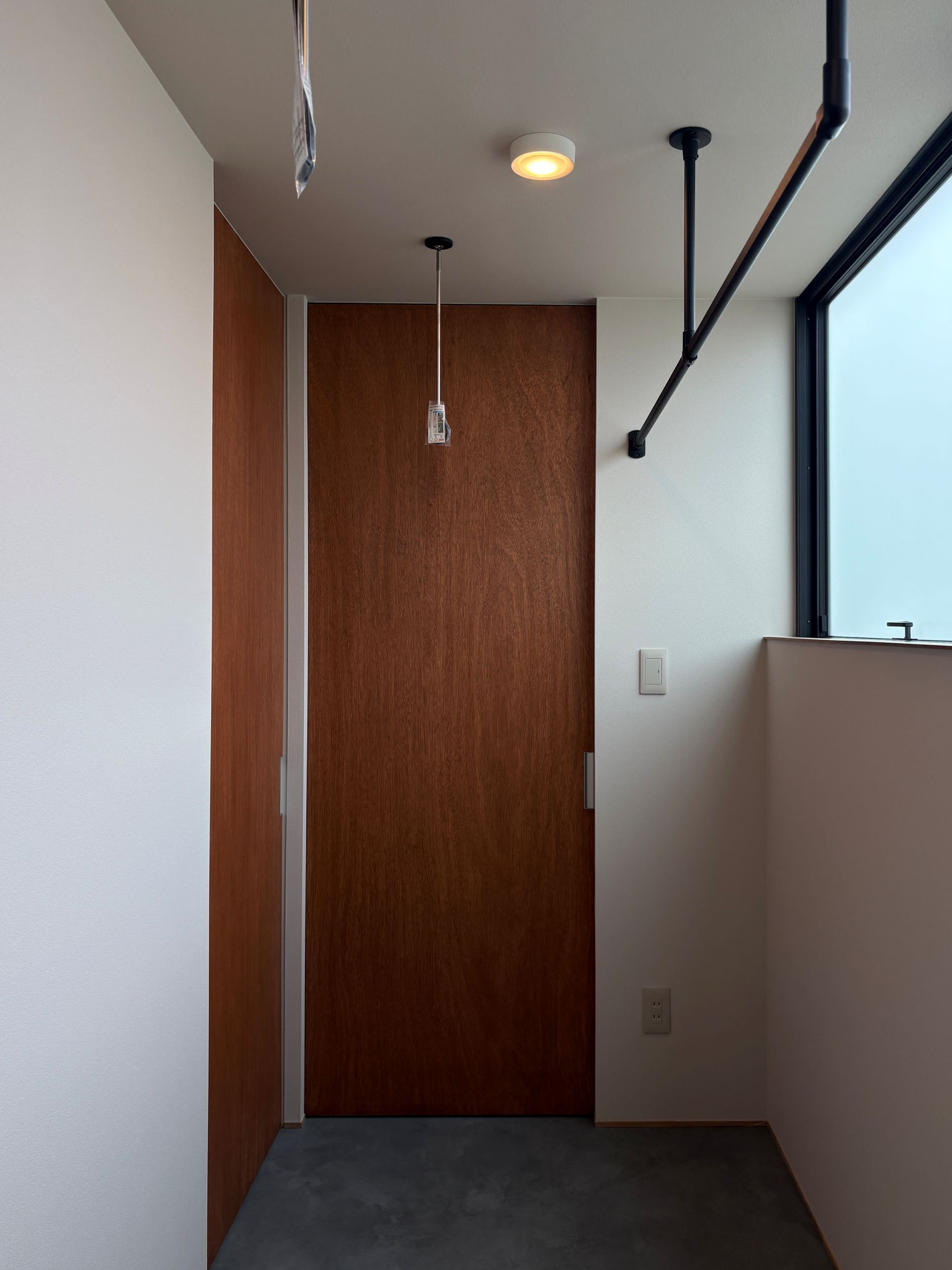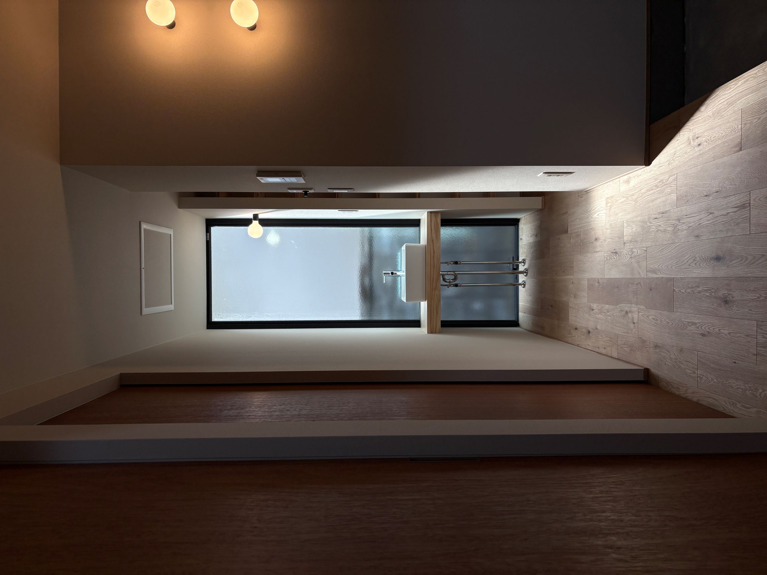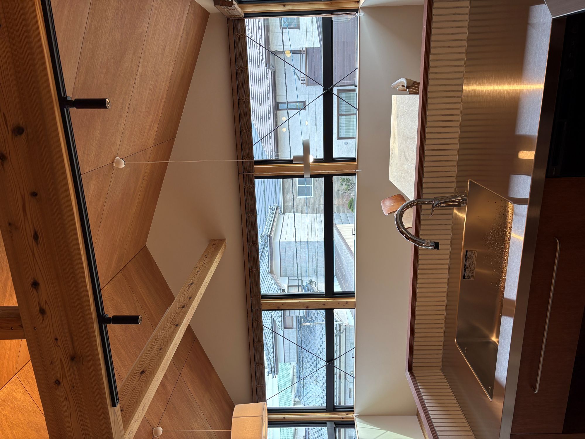 南面は全面開口と木製ブラインドで光と熱を自在に調整。北側玄関はオープンな木製階段と吹き抜けで自然光を取り込み、モダンな暖簾が来客を迎えます。寝室・WIC・ランドリーを一直線に配置し、2面採光で通風も確保。