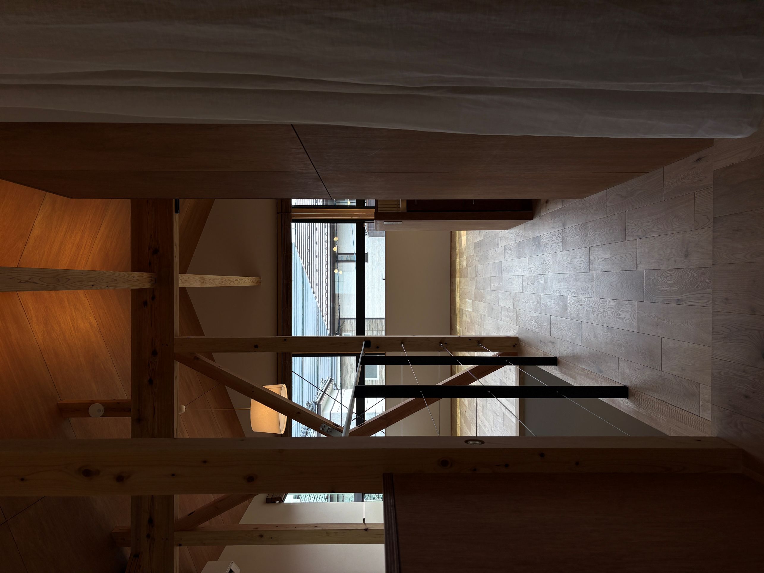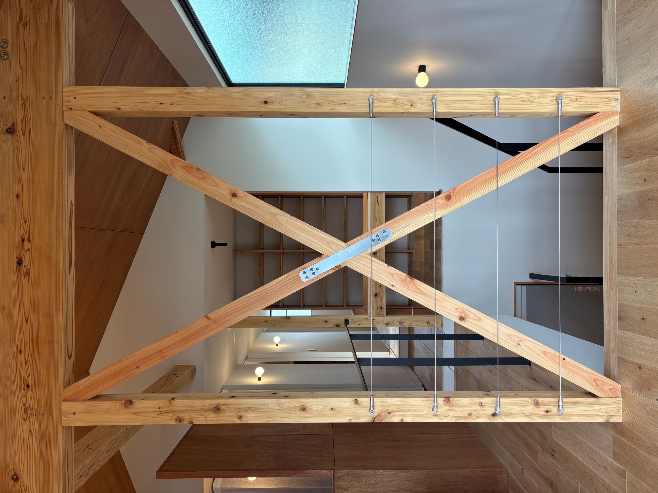 90角材をたすき掛けにした筋交いをそのまま意匠に。構造材を表しにすることで、住まいに温かみと力強さを添えました。