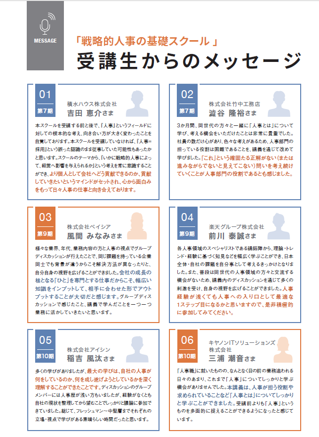 本コースでは、一流の講師陣から学ぶことと、異業種の同世代の人事の人達と互いに刺激しあいながら成長速度を加速させ、人事のプロフェッショナルを目指して頂ければと思います。