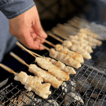 千曲市の杏と玉ねぎのにんにく醤油だれ焼き鳥を炭火で焼き上げます。