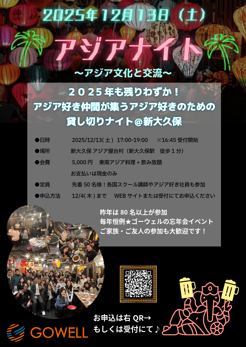 昨年100名規模で大盛況を博したゴーウェル恒例忘年会を、今年はさらにパワーアップして開催いたします!