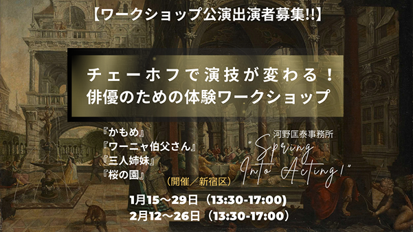この度、河野匡泰事務所では、チェーホフ戯曲抜粋による3日間集中演技ワークショップを開催いたします。