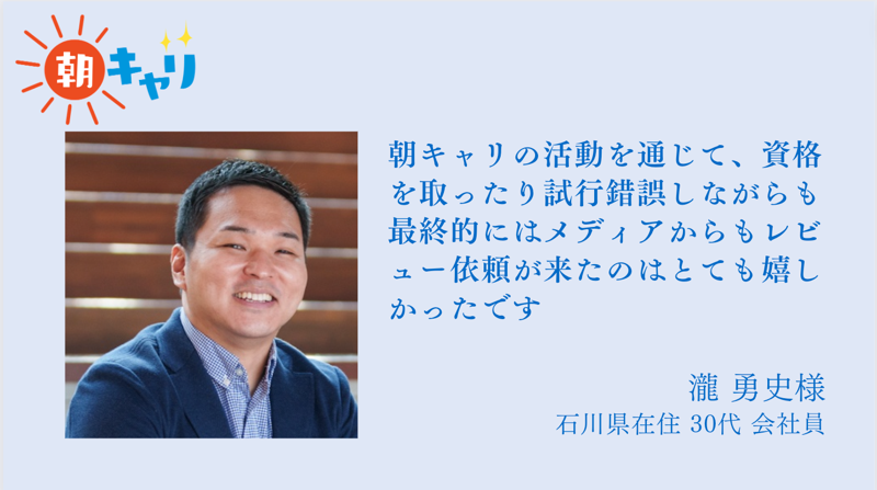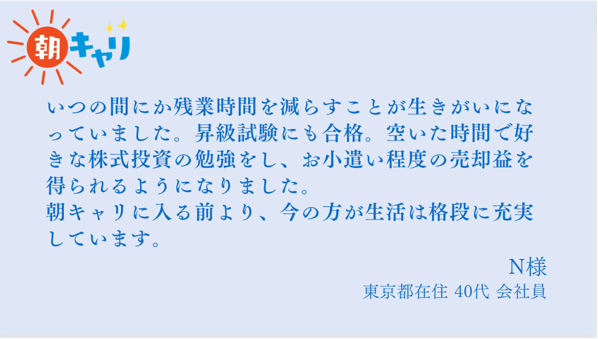 Q:興味はありますが迷っています。どんなことをしているかが分かる動画はありますか?無料メール動画講座にて、朝キャリがどんな場かについても触れています。よろしければご登録ください。