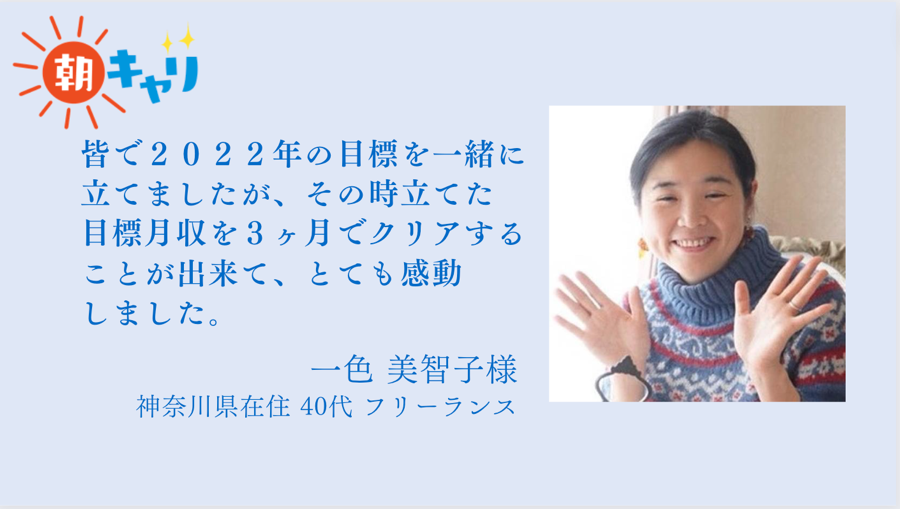 朝キャリでは、池田からの早起き定着のためのコツを解説した動画のほか、朝起きたら淡々とおはよう挨拶するスペースや、朝からZoomで集まり、もくもくと手帳を記入する「もくもく会」、朝7時からのセミナーなどを開催しており、早起きを定着させるためのサポート体制がございます。また、早起きは目的ではなく単なる手段です。自分の人生を自分の思うように生きたい!と思う方のコミュニティが朝キャリなので、実際は夜型の方も多くいらっしゃいますので早起きできない人でも大丈夫です。安心して入会ください。