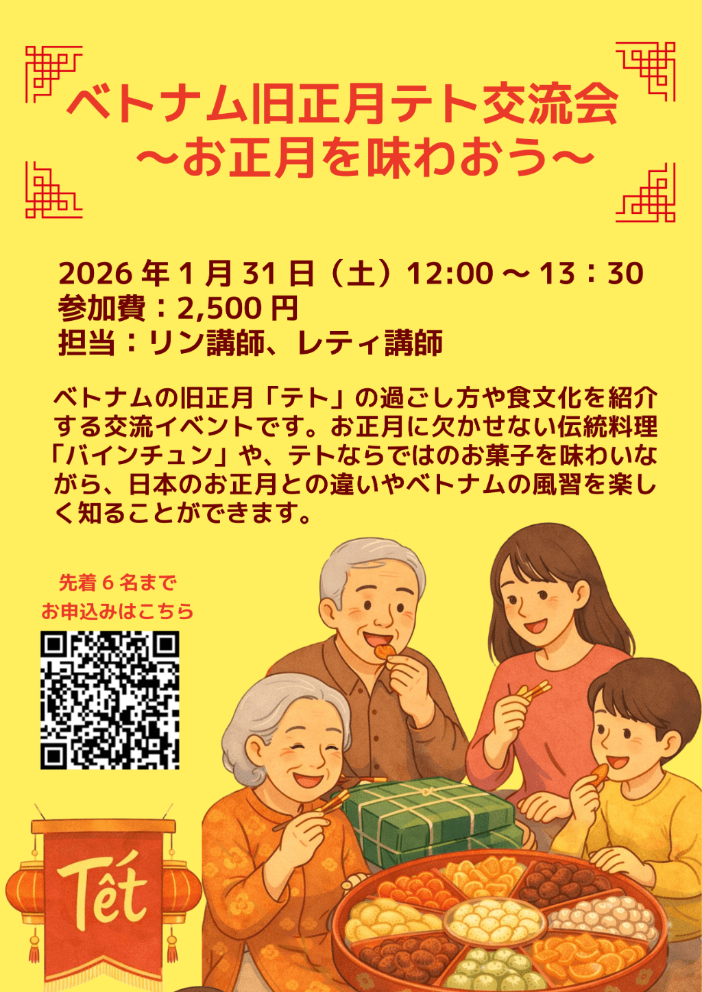 ■開催日時 2026年1月31日(土)12:00~13:30■参加費 2,500円(ベトナムの伝統的なちまきバインチュンやお正月のお菓子付き)