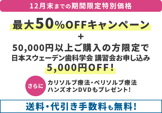 特別販売企画中に50,000円以上、御注文くださる皆様には、日本スウェーデン歯科学会により制作された「カリソルブ療法」「ペリソルブ療法」ハンズオンDVDをプレゼントさせて頂きます