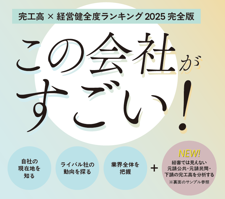 ・完工高ランキングは従来の総合計に加え、その内訳である元請公共・元請民間・下請を追加しました。その4種ごとの29工種・その他建設工事の1位から最下位までの完全版と、経営健全度ランキングは3指標(売上高経常利益率、自己資本比率、総資本回転率)の1位から最下位までの完全版です。