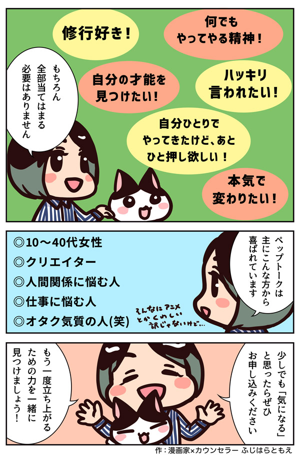 | とても勉強になりました。 巴さんの、洞察力が鋭くて、 自分で気づかない長所に 目を向けるきっかけになりました。 受けてよかったです。 (Nさん/40代女性・愛知) |