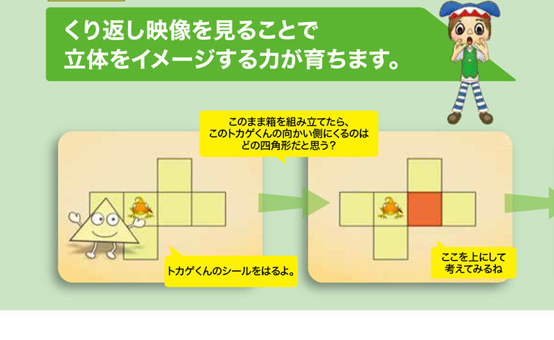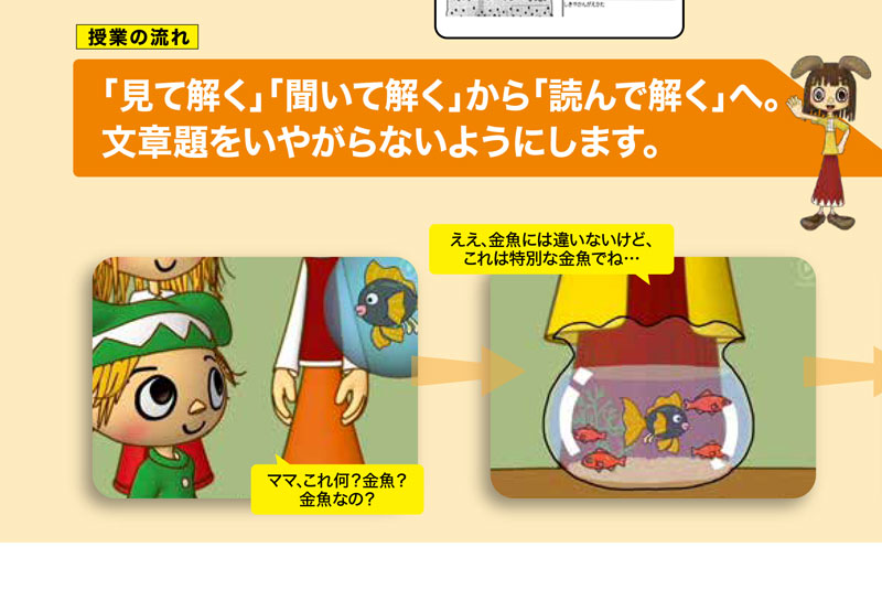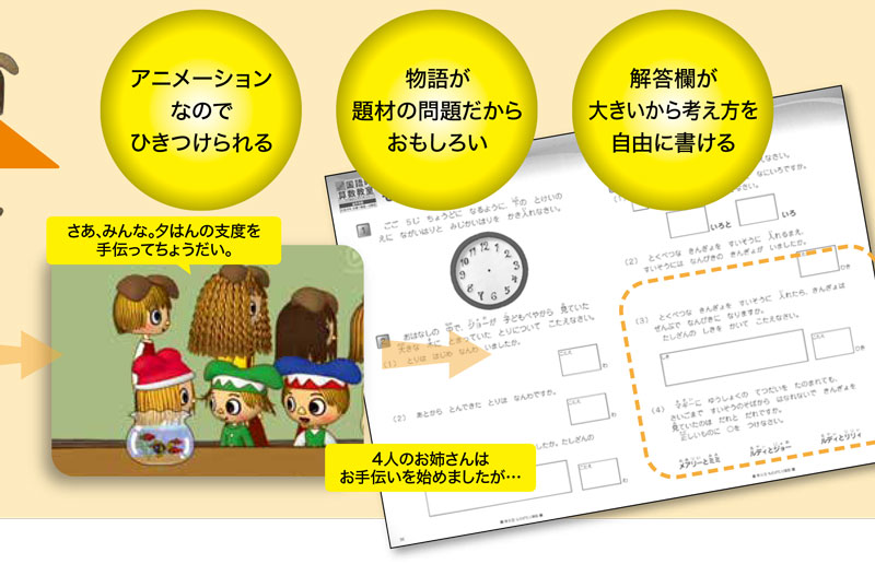 『玉井式国語的算数』は文章を”イメージする力”を育み、「読解力」、「算数力」を高める画期的な指導教材です。文字より絵、文章よりも映像から勉強の世界に入るのが大好きな低学年のお子さんの特性を活かし、アニメ映像とオリジナル教材により、効果的に「イメージする力」を育て「問題を読み解く力」「考える力」に変えていきます。